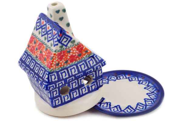 This Grecian Fire Tulips 5" House Shaped Candle Holder was handmade and hand decorated in Boleslawiec, Poland by skilled artisans according to old traditional methods. This Polish stoneware is microwave, dishwasher, freezer, and oven safe up to 480°F. It does not contain lead or cadmium. It is part of the Grecian Fire Tulips Collection.