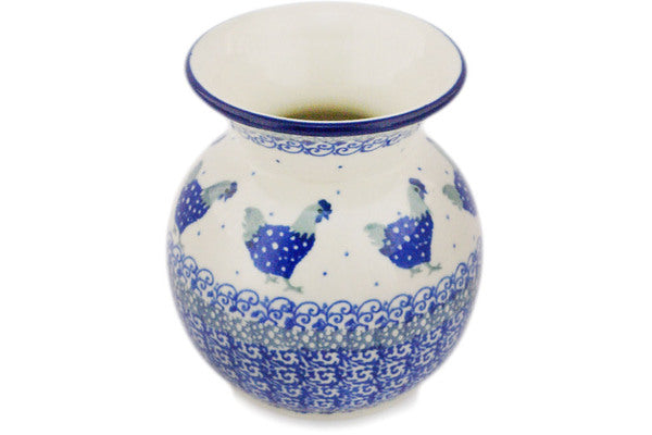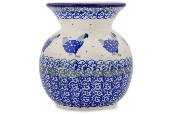 This Blue Chicken 4" Vase was handmade and hand decorated in Boleslawiec, Poland by skilled artisans according to old traditional methods. This Polish stoneware is microwave, dishwasher, freezer, and oven safe up to 480°F. It does not contain lead or cadmium. It is part of the Blue Chicken Collection.