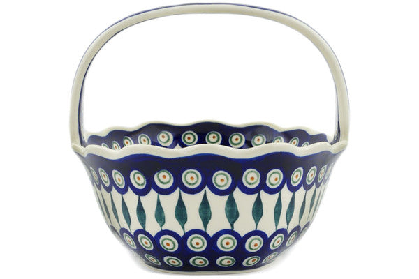 This Peacock Leaves 11" Basket with Handle was handmade and hand decorated in Boleslawiec, Poland by skilled artisans according to old traditional methods. This Polish stoneware is microwave, dishwasher, freezer, and oven safe up to 480°F. It does not contain lead or cadmium. It is part of the Peacock Leaves Collection.