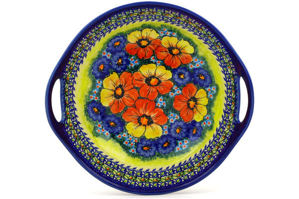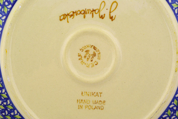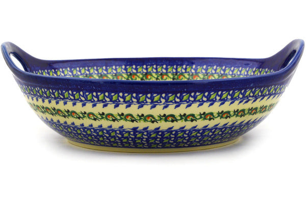 This Mystical Garden 10" Bowl with Handles was handmade and hand decorated in Boleslawiec, Poland by skilled artisans according to old traditional methods. This is a Polish pottery Signature Unikat, which means that it has been hand painted with both sponges and brushes and it is signed by the artist who painted it. Unikat pieces are the most intricate works of art. Larger Unikat items take hours of very careful work to finish. This Polish stoneware is microwave, dishwasher, freezer, and oven safe up to 480°F. It does not contain lead or cadmium. It is part of the Mystical Garden Collection.