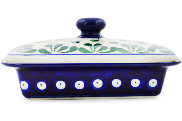This Bleeding Heart Peacock 7" Butter Dish was handmade and hand decorated in Boleslawiec, Poland by skilled artisans according to old traditional methods. This Polish stoneware is microwave, dishwasher, freezer, and oven safe up to 480°F. It does not contain lead or cadmium. It is part of the Bleeding Heart Peacock Collection.