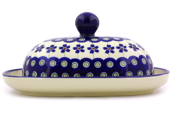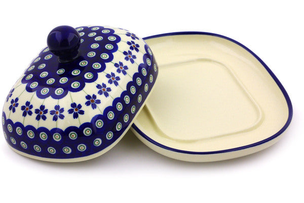 This Flowering Peacock 8" Butter Dish was handmade and hand decorated in Boleslawiec, Poland by skilled artisans according to old traditional methods. This Polish stoneware is microwave, dishwasher, freezer, and oven safe up to 480°F. It does not contain lead or cadmium. It is part of the Flowering Peacock Collection.