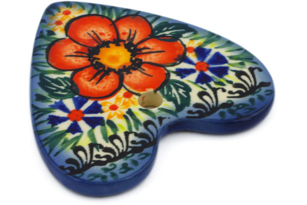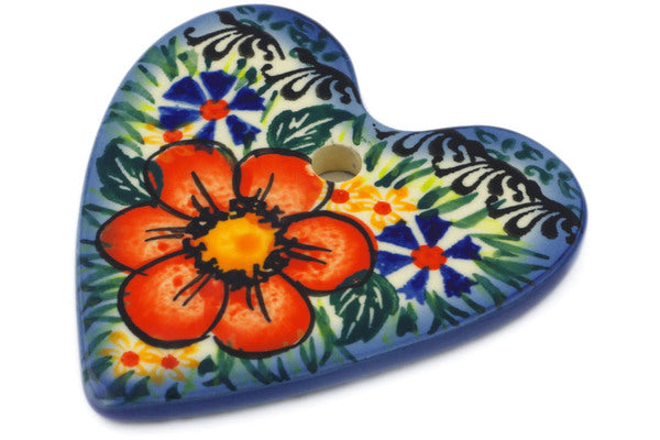 This Wild Bouquet 3" Heart Pendant was handmade and hand decorated in Boleslawiec, Poland by skilled artisans according to old traditional methods. This is a Polish pottery Signature Unikat, which means that it has been hand painted with both sponges and brushes and it is signed by the artist who painted it. Unikat pieces are the most intricate works of art. Larger Unikat items take hours of very careful work to finish. This Polish stoneware is microwave, dishwasher, freezer, and oven safe up to 480°F. It does not contain lead or cadmium. It is part of the Wild Bouquet Collection.