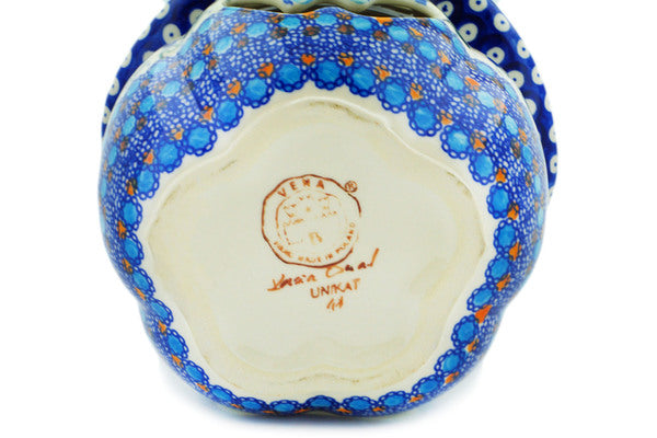 This Blue Tulip Garden 10" Jack O Lantern Candle Holder was handmade and hand decorated in Boleslawiec, Poland by skilled artisans according to old traditional methods. This is a Polish pottery Signature Unikat, which means that it has been hand painted with both sponges and brushes and it is signed by the artist who painted it. Unikat pieces are the most intricate works of art. Larger Unikat items take hours of very careful work to finish. This Polish stoneware is microwave, dishwasher, freezer, and oven safe up to 480°F. It does not contain lead or cadmium. It is part of the Blue Tulip Garden Collection.