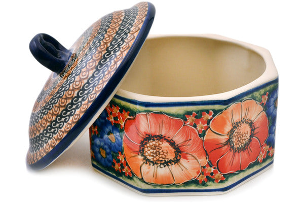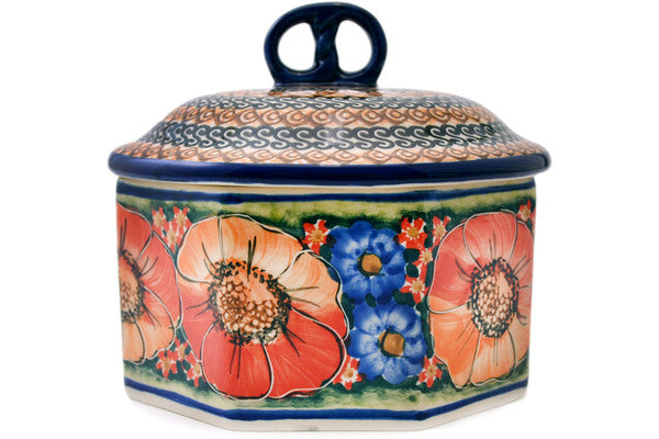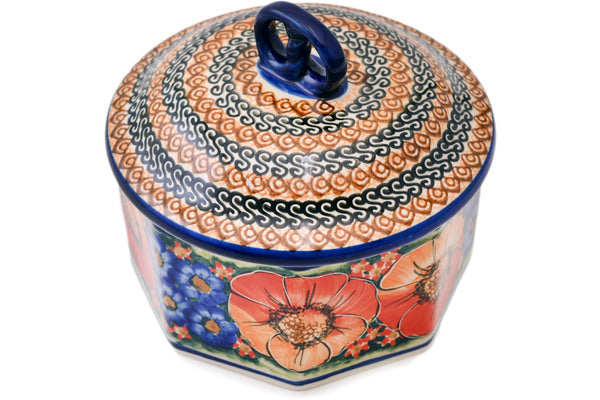 This Bright Beauty 7" Jar with Lid was handmade and hand decorated in Boleslawiec, Poland by skilled artisans according to old traditional methods. This is a Polish pottery Signature Unikat, which means that it has been hand painted with both sponges and brushes and it is signed by the artist who painted it. Unikat pieces are the most intricate works of art. Larger Unikat items take hours of very careful work to finish. This Polish stoneware is microwave, dishwasher, freezer, and oven safe up to 480°F. It does not contain lead or cadmium. It is part of the Bright Beauty Collection.