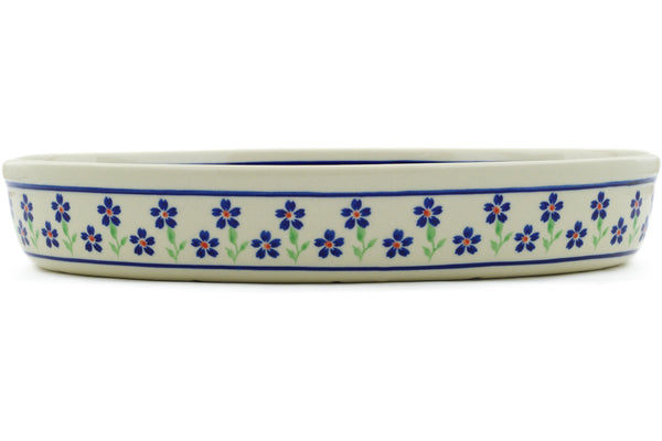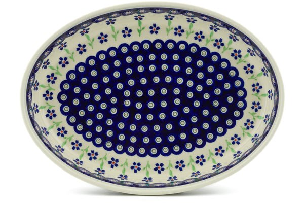 This Bright Peacock Daisy 12" Oval Baker was handmade and hand decorated in Boleslawiec, Poland by skilled artisans according to old traditional methods. This Polish stoneware is microwave, dishwasher, freezer, and oven safe up to 480°F. It does not contain lead or cadmium. It is part of the Bright Peacock Daisy Collection.
