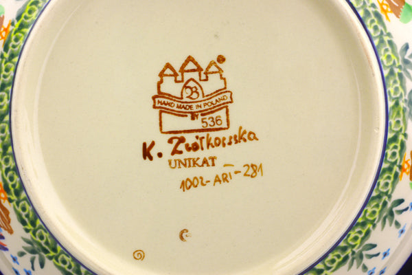 This Country Rooster 9" Pasta Bowl was handmade and hand decorated in Boleslawiec, Poland by skilled artisans according to old traditional methods. This is a Polish pottery Signature Unikat, which means that it has been hand painted with both sponges and brushes and it is signed by the artist who painted it. Unikat pieces are the most intricate works of art. Larger Unikat items take hours of very careful work to finish. This Polish stoneware is microwave, dishwasher, freezer, and oven safe up to 480°F. It does not contain lead or cadmium. It is part of the Country Rooster Collection.