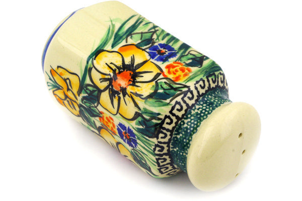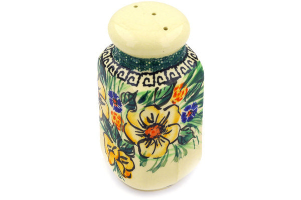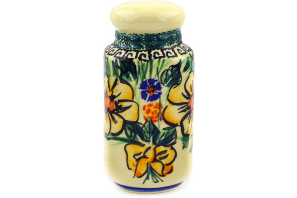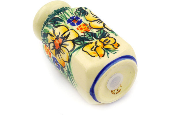 This Yellow Flower 5" Pepper Shaker was handmade and hand decorated in Boleslawiec, Poland by skilled artisans according to old traditional methods. This is a Polish pottery Signature Unikat, which means that it has been hand painted with both sponges and brushes and it is signed by the artist who painted it. Unikat pieces are the most intricate works of art. Larger Unikat items take hours of very careful work to finish. This Polish stoneware is microwave, dishwasher, freezer, and oven safe up to 480°F. It does not contain lead or cadmium. It is part of the Yellow Flower Collection.