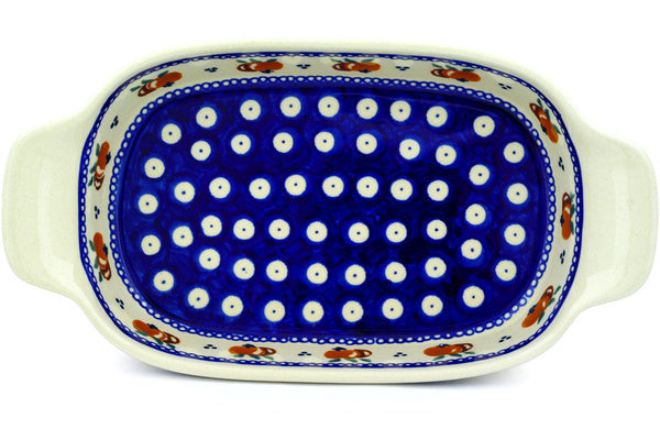 This Country Apple Peacock Small Serving Dish or Baker was handmade and hand decorated in Boleslawiec, Poland by skilled artisans according to old traditional methods. This Polish stoneware is microwave, dishwasher, freezer, and oven safe up to 480°F. It does not contain lead or cadmium. It is part of the Country Apple Peacock Collection.