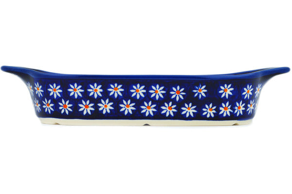 This Water Daisy Small Serving Dish or Baker was handmade and hand decorated in Boleslawiec, Poland by skilled artisans according to old traditional methods. This Polish stoneware is microwave, dishwasher, freezer, and oven safe up to 480°F. It does not contain lead or cadmium. It is part of the Water Daisy Collection.