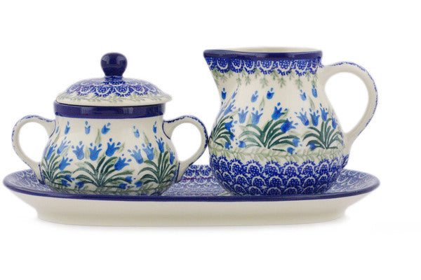 This Feathery Bluebells 11" Sugar and Creamer Set was handmade and hand decorated in Boleslawiec, Poland by skilled artisans according to old traditional methods. This Polish stoneware is microwave, dishwasher, freezer, and oven safe up to 480°F. It does not contain lead or cadmium. It is part of the Feathery Bluebells Collection.