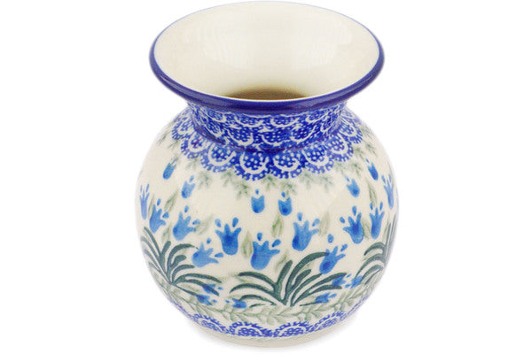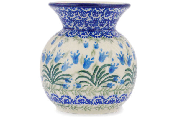 This Feathery Bluebells 4" Vase was handmade and hand decorated in Boleslawiec, Poland by skilled artisans according to old traditional methods. This Polish stoneware is microwave, dishwasher, freezer, and oven safe up to 480°F. It does not contain lead or cadmium. It is part of the Feathery Bluebells Collection.
