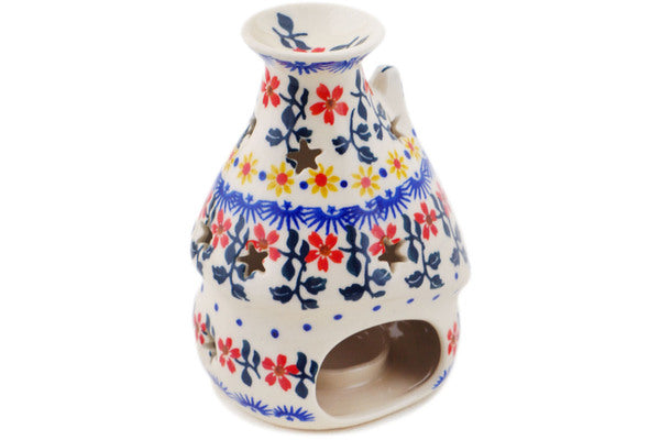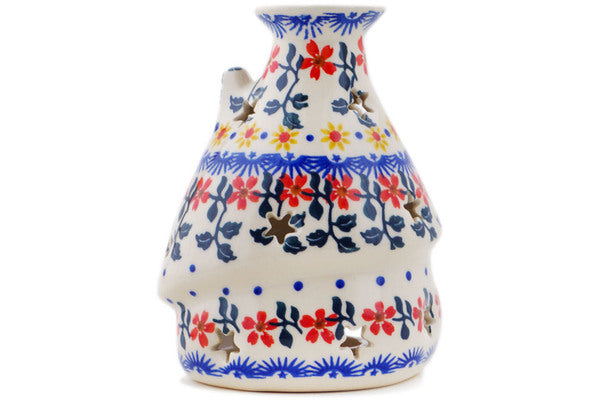 This Red Sunflower 5" House Shaped Candle Holder was handmade and hand decorated in Boleslawiec, Poland by skilled artisans according to old traditional methods. This Polish stoneware is microwave, dishwasher, freezer, and oven safe up to 480°F. It does not contain lead or cadmium. It is part of the Red Sunflower Collection.