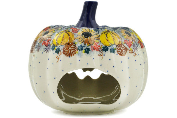 This Autumn Falling Leaves 7" Jack O Lantern Candle Holder was handmade and hand decorated in Boleslawiec, Poland by skilled artisans according to old traditional methods. This is a Polish pottery Signature Unikat, which means that it has been hand painted with both sponges and brushes and it is signed by the artist who painted it. Unikat pieces are the most intricate works of art. Larger Unikat items take hours of very careful work to finish. This Polish stoneware is microwave, dishwasher, freezer, and oven safe up to 480°F. It does not contain lead or cadmium. It is part of the Autumn Falling Leaves Collection.