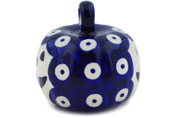 This Peacock Eyes 2" Pumpkin Ornament was handmade and hand decorated in Boleslawiec, Poland by skilled artisans according to old traditional methods. This Polish stoneware is microwave, dishwasher, freezer, and oven safe up to 480°F. It does not contain lead or cadmium. It is part of the Peacock Eyes Collection.