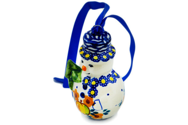This Apple 4" Snowman Ornament was handmade and hand decorated in Boleslawiec, Poland by skilled artisans according to old traditional methods. This is a Polish pottery Signature Unikat, which means that it has been hand painted with both sponges and brushes and it is signed by the artist who painted it. Unikat pieces are the most intricate works of art. Larger Unikat items take hours of very careful work to finish. This Polish stoneware is microwave, dishwasher, freezer, and oven safe up to 480°F. It does not contain lead or cadmium. It is part of the Apple Collection.