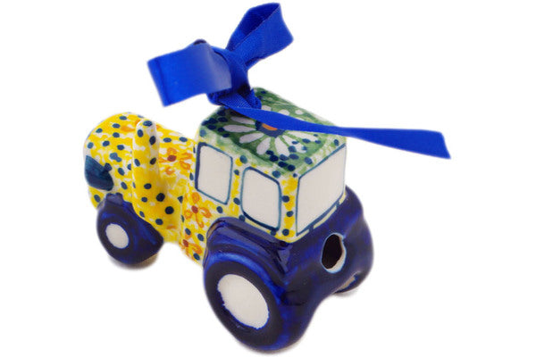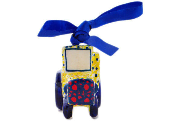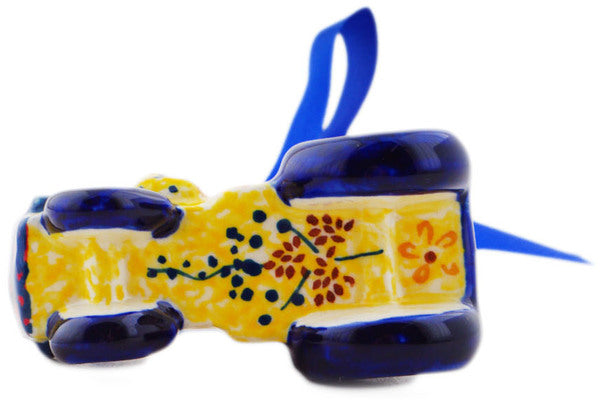This Sunshine Grotto 3" Tractor Ornament was handmade and hand decorated in Boleslawiec, Poland by skilled artisans according to old traditional methods. This is a Polish pottery Signature Unikat, which means that it has been hand painted with both sponges and brushes and it is signed by the artist who painted it. Unikat pieces are the most intricate works of art. Larger Unikat items take hours of very careful work to finish. This Polish stoneware is microwave, dishwasher, freezer, and oven safe up to 480°F. It does not contain lead or cadmium. It is part of the Sunshine Grotto Collection.