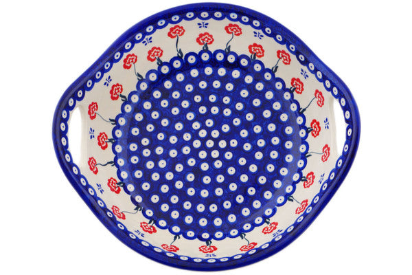 This Blue Eye Spring 11½-inch Bowl with Handles was handmade and hand decorated in Boleslawiec, Poland by skilled artisans according to old traditional methods. This Polish stoneware is microwave, dishwasher, freezer, and oven safe up to 480°F. It does not contain lead or cadmium. It is part of the Blue Eye Spring Collection.