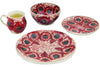This Sugar Plum Poppies Place Setting was handmade and hand decorated in Boleslawiec, Poland by skilled artisans according to old traditional methods. This is a Polish pottery Signature Unikat, which means that it has been hand painted with both sponges and brushes and it is signed by the artist who painted it. Unikat pieces are the most intricate works of art. Larger Unikat items take hours of very careful work to finish. This Polish stoneware is microwave, dishwasher, freezer, and oven safe up to 480°F. It does not contain lead or cadmium. It is part of the Sugar Plum Poppies Collection.
