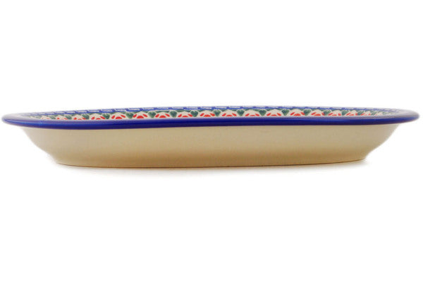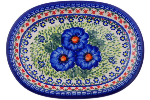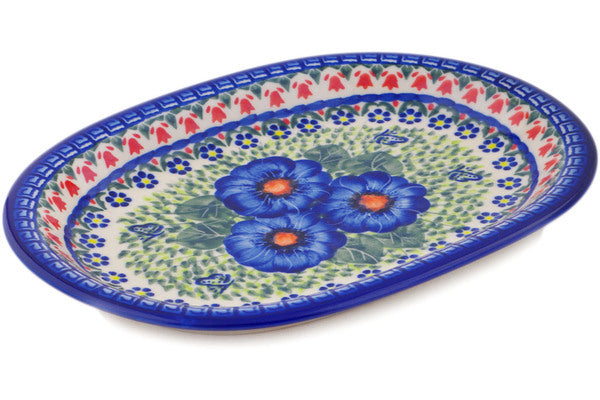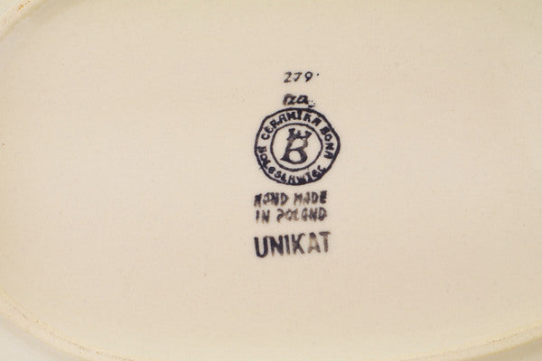 This Brilliant Butterfly Popp 11" Oval Platter was handmade and hand decorated in Boleslawiec, Poland by skilled artisans according to old traditional methods. This is a Polish pottery Signature Unikat, which means that it has been hand painted with both sponges and brushes and it is signed by the artist who painted it. Unikat pieces are the most intricate works of art. Larger Unikat items take hours of very careful work to finish. This Polish stoneware is microwave, dishwasher, freezer, and oven safe up to 480°F. It does not contain lead or cadmium. It is part of the Brilliant Butterfly Popp Collection.