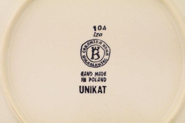 This Gorgeous Morning Glory 10" Plate was handmade and hand decorated in Boleslawiec, Poland by skilled artisans according to old traditional methods. This is a Polish pottery Signature Unikat, which means that it has been hand painted with both sponges and brushes and it is signed by the artist who painted it. Unikat pieces are the most intricate works of art. Larger Unikat items take hours of very careful work to finish. This Polish stoneware is microwave, dishwasher, freezer, and oven safe up to 480°F. It does not contain lead or cadmium. It is part of the Gorgeous Morning Glory Collection.