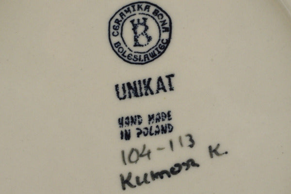 This Midnight Garden 10" Plate was handmade and hand decorated in Boleslawiec, Poland by skilled artisans according to old traditional methods. This is a Polish pottery Signature Unikat, which means that it has been hand painted with both sponges and brushes and it is signed by the artist who painted it. Unikat pieces are the most intricate works of art. Larger Unikat items take hours of very careful work to finish. This Polish stoneware is microwave, dishwasher, freezer, and oven safe up to 480°F. It does not contain lead or cadmium. It is part of the Midnight Garden Collection.