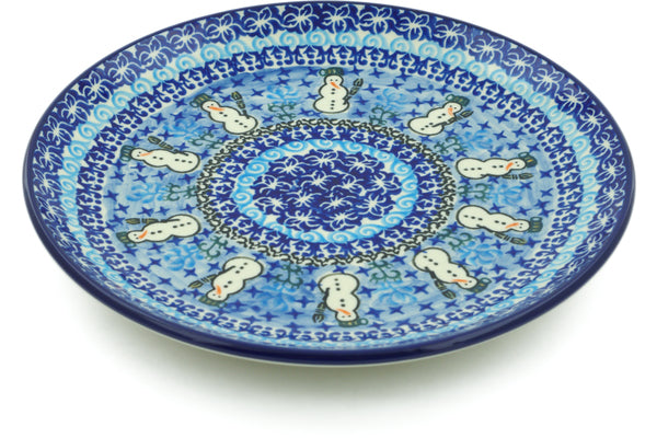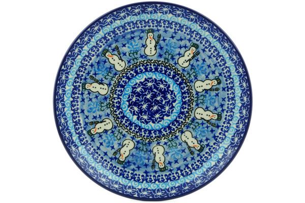 This Snowmen Circle 10" Plate was handmade and hand decorated in Boleslawiec, Poland by skilled artisans according to old traditional methods. This is a Polish pottery Signature Unikat, which means that it has been hand painted with both sponges and brushes and it is signed by the artist who painted it. Unikat pieces are the most intricate works of art. Larger Unikat items take hours of very careful work to finish. This Polish stoneware is microwave, dishwasher, freezer, and oven safe up to 480°F. It does not contain lead or cadmium. It is part of the Snowmen Circle Collection.