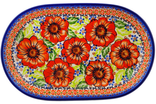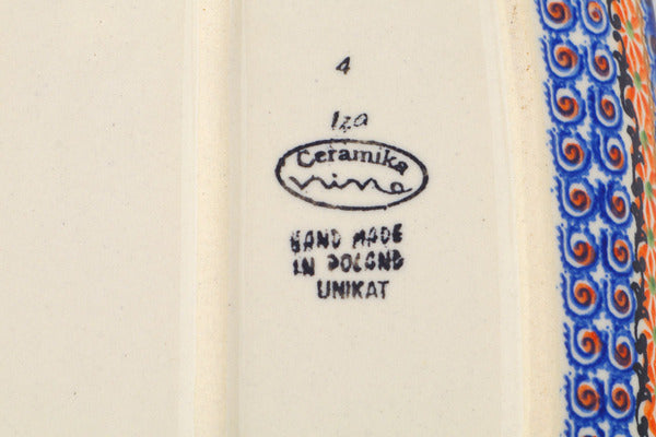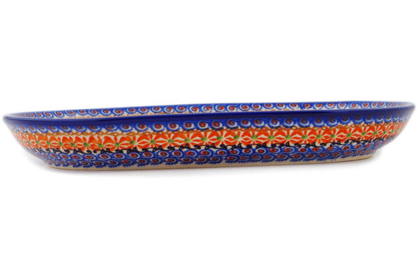This Orange Zinnia 11" Platter was handmade and hand decorated in Boleslawiec, Poland by skilled artisans according to old traditional methods. This is a Polish pottery Signature Unikat, which means that it has been hand painted with both sponges and brushes and it is signed by the artist who painted it. Unikat pieces are the most intricate works of art. Larger Unikat items take hours of very careful work to finish. This Polish stoneware is microwave, dishwasher, freezer, and oven safe up to 480°F. It does not contain lead or cadmium. It is part of the Orange Zinnia Collection.