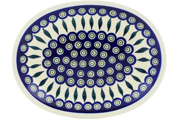 This Peacock Leaves 11" Platter was handmade and hand decorated in Boleslawiec, Poland by skilled artisans according to old traditional methods. This Polish stoneware is microwave, dishwasher, freezer, and oven safe up to 480°F. It does not contain lead or cadmium. It is part of the Peacock Leaves Collection.
