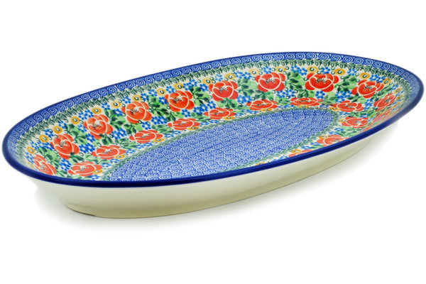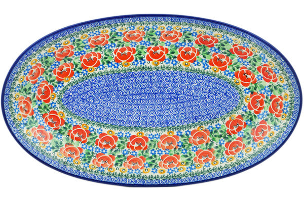 This Red Poppy Burst 18" Platter was handmade and hand decorated in Boleslawiec, Poland by skilled artisans according to old traditional methods. This is a Polish pottery Signature Unikat, which means that it has been hand painted with both sponges and brushes and it is signed by the artist who painted it. Unikat pieces are the most intricate works of art. Larger Unikat items take hours of very careful work to finish. This Polish stoneware is microwave, dishwasher, freezer, and oven safe up to 480°F. It does not contain lead or cadmium. It is part of the Red Poppy Burst Collection.