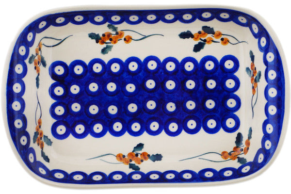 This Yellow Holly Berries 10" Platter with Handles was handmade and hand decorated in Boleslawiec, Poland by skilled artisans according to old traditional methods. This Polish stoneware is microwave, dishwasher, freezer, and oven safe up to 480°F. It does not contain lead or cadmium. It is part of the Yellow Holly Berries Collection.