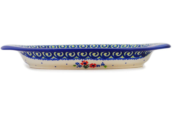 This Country Three 12" Platter with Handles was handmade and hand decorated in Boleslawiec, Poland by skilled artisans according to old traditional methods. This is a Polish pottery Signature Unikat, which means that it has been hand painted with both sponges and brushes and it is signed by the artist who painted it. Unikat pieces are the most intricate works of art. Larger Unikat items take hours of very careful work to finish. This Polish stoneware is microwave, dishwasher, freezer, and oven safe up to 480°F. It does not contain lead or cadmium. It is part of the Country Three Collection.