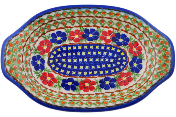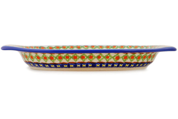 This Paradise Poppy 12" Platter with Handles was handmade and hand decorated in Boleslawiec, Poland by skilled artisans according to old traditional methods. This Polish stoneware is microwave, dishwasher, freezer, and oven safe up to 480°F. It does not contain lead or cadmium. It is part of the Paradise Poppy Collection.