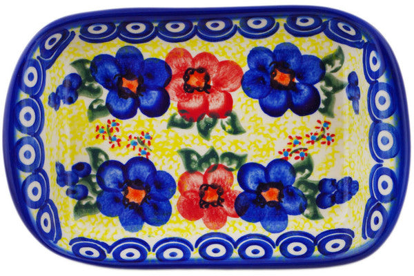 This Neon Poppies 7" Platter with Handles was handmade and hand decorated in Boleslawiec, Poland by skilled artisans according to old traditional methods. This Polish stoneware is microwave, dishwasher, freezer, and oven safe up to 480°F. It does not contain lead or cadmium. It is part of the Neon Poppies Collection.