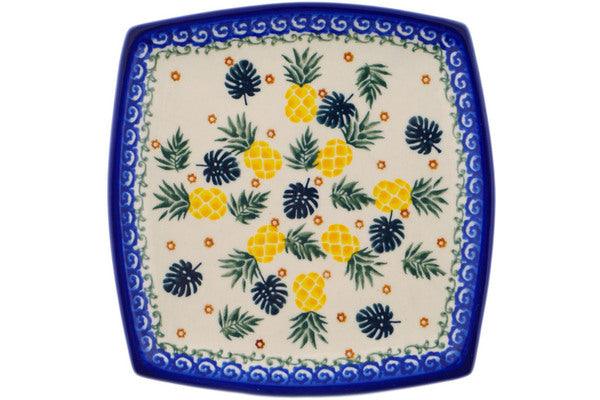This Pineapple Parade 7" Square Plate was handmade and hand decorated in Boleslawiec, Poland by skilled artisans according to old traditional methods. This Polish stoneware is microwave, dishwasher, freezer, and oven safe up to 480°F. It does not contain lead or cadmium. It is part of the Pineapple Parade Collection.