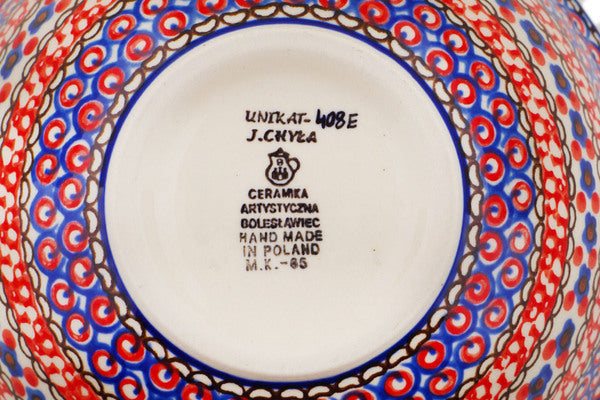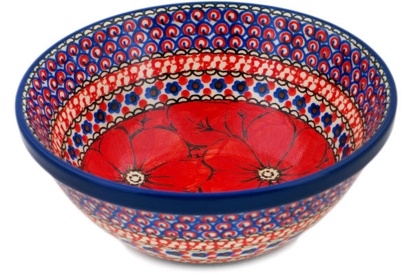 This Crimson Poppies 6" Bowl was handmade and hand decorated in Boleslawiec, Poland by skilled artisans according to old traditional methods. This is a Polish pottery Signature Unikat, which means that it has been hand painted with both sponges and brushes and it is signed by the artist who painted it. Unikat pieces are the most intricate works of art. Larger Unikat items take hours of very careful work to finish. This Polish stoneware is microwave, dishwasher, freezer, and oven safe up to 480°F. It does not contain lead or cadmium. It is part of the Crimson Poppies Collection.