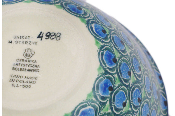 This Peacock Show 6" Bowl was handmade and hand decorated in Boleslawiec, Poland by skilled artisans according to old traditional methods. This is a Polish pottery Signature Unikat, which means that it has been hand painted with both sponges and brushes and it is signed by the artist who painted it. Unikat pieces are the most intricate works of art. Larger Unikat items take hours of very careful work to finish. This Polish stoneware is microwave, dishwasher, freezer, and oven safe up to 480°F. It does not contain lead or cadmium. It is part of the Peacock Show Collection.