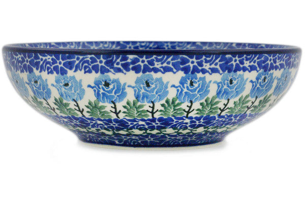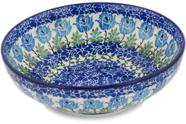 This Blue Rosette Wreath 7" Bowl was handmade and hand decorated in Boleslawiec, Poland by skilled artisans according to old traditional methods. This Polish stoneware is microwave, dishwasher, freezer, and oven safe up to 480°F. It does not contain lead or cadmium. It is part of the Blue Rosette Wreath Collection.