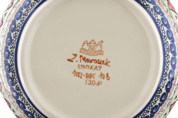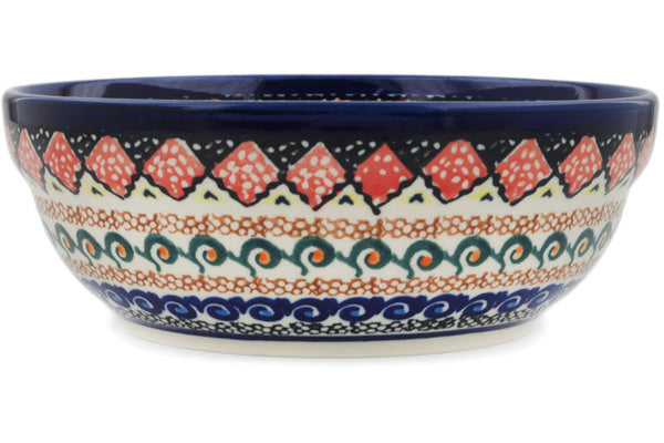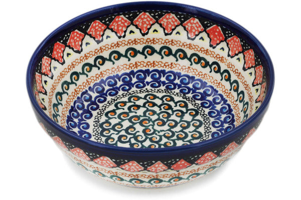 This Coral Diamonds 7" Bowl was handmade and hand decorated in Boleslawiec, Poland by skilled artisans according to old traditional methods. This is a Polish pottery Signature Unikat, which means that it has been hand painted with both sponges and brushes and it is signed by the artist who painted it. Unikat pieces are the most intricate works of art. Larger Unikat items take hours of very careful work to finish. This Polish stoneware is microwave, dishwasher, freezer, and oven safe up to 480°F. It does not contain lead or cadmium. It is part of the Coral Diamonds Collection.