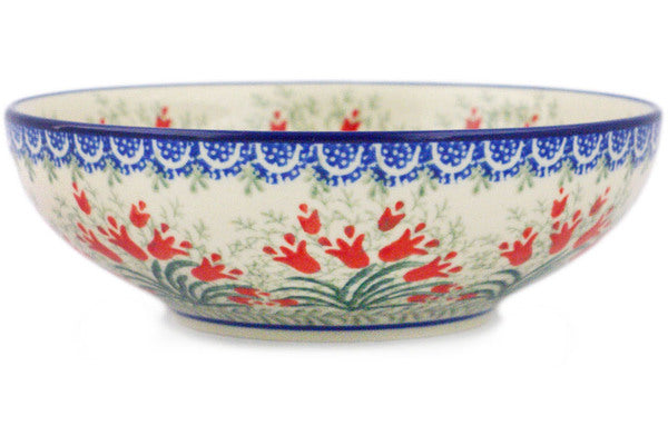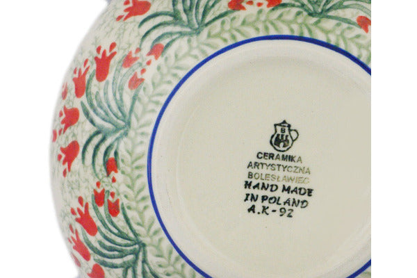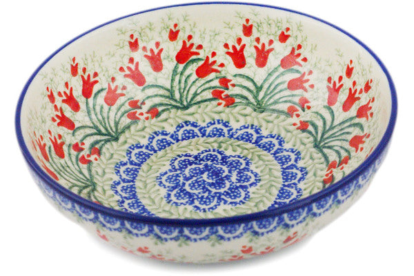 This Crimson Bells 7" Bowl was handmade and hand decorated in Boleslawiec, Poland by skilled artisans according to old traditional methods. This Polish stoneware is microwave, dishwasher, freezer, and oven safe up to 480°F. It does not contain lead or cadmium. It is part of the Crimson Bells Collection.