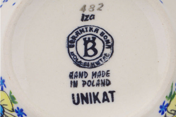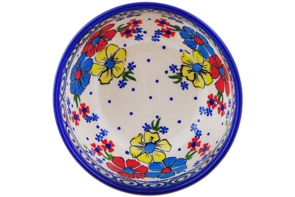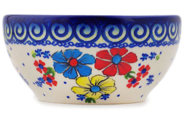 This Country Three 5" Bowl was handmade and hand decorated in Boleslawiec, Poland by skilled artisans according to old traditional methods. This is a Polish pottery Signature Unikat, which means that it has been hand painted with both sponges and brushes and it is signed by the artist who painted it. Unikat pieces are the most intricate works of art. Larger Unikat items take hours of very careful work to finish. This Polish stoneware is microwave, dishwasher, freezer, and oven safe up to 480°F. It does not contain lead or cadmium. It is part of the Country Three Collection.