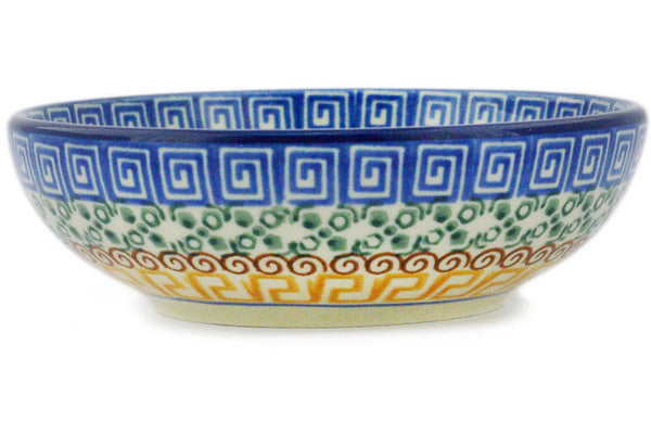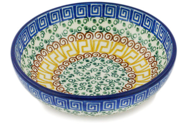 This Grecian Sea 5" Bowl was handmade and hand decorated in Boleslawiec, Poland by skilled artisans according to old traditional methods. This Polish stoneware is microwave, dishwasher, freezer, and oven safe up to 480°F. It does not contain lead or cadmium. It is part of the Grecian Sea Collection.