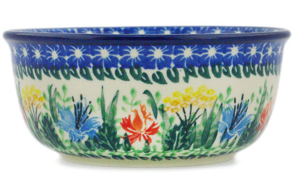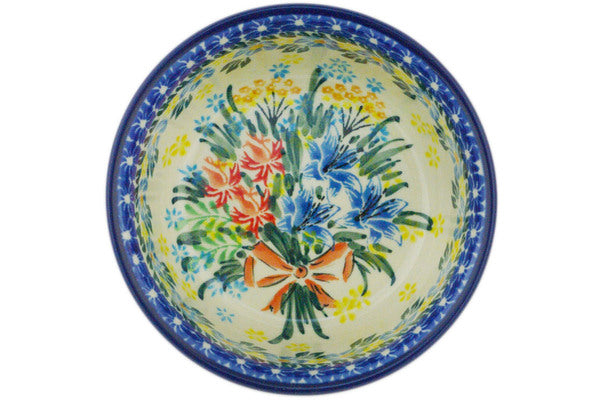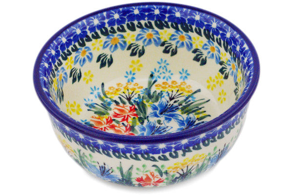 This Summer Bouquet 5" Bowl was handmade and hand decorated in Boleslawiec, Poland by skilled artisans according to old traditional methods. This is a Polish pottery Signature Unikat, which means that it has been hand painted with both sponges and brushes and it is signed by the artist who painted it. Unikat pieces are the most intricate works of art. Larger Unikat items take hours of very careful work to finish. This Polish stoneware is microwave, dishwasher, freezer, and oven safe up to 480°F. It does not contain lead or cadmium. It is part of the Summer Bouquet Collection.