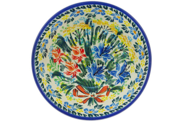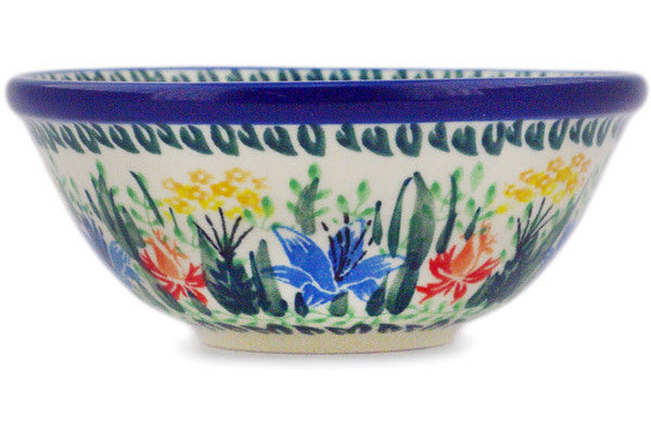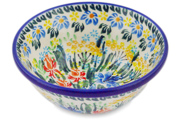 This Summer Bouquet 5" Bowl was handmade and hand decorated in Boleslawiec, Poland by skilled artisans according to old traditional methods. This is a Polish pottery Signature Unikat, which means that it has been hand painted with both sponges and brushes and it is signed by the artist who painted it. Unikat pieces are the most intricate works of art. Larger Unikat items take hours of very careful work to finish. This Polish stoneware is microwave, dishwasher, freezer, and oven safe up to 480°F. It does not contain lead or cadmium. It is part of the Summer Bouquet Collection.