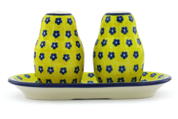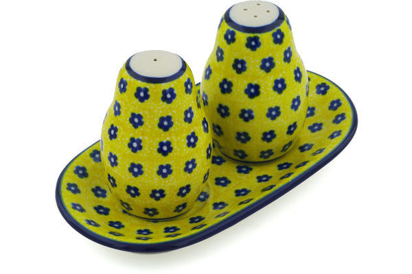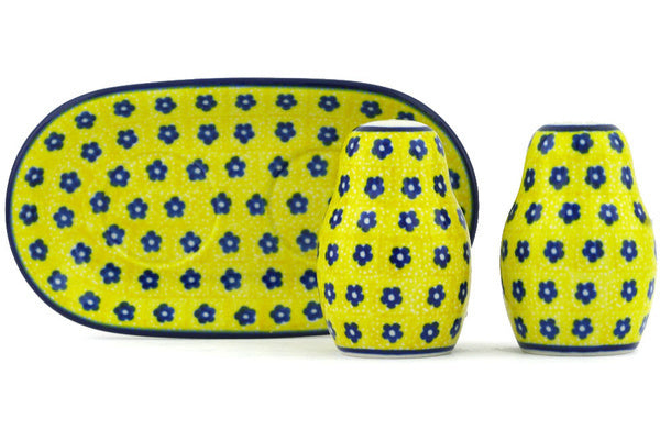 This Sunshine 7" Salt and Pepper 3-Piece Set was handmade and hand decorated in Boleslawiec, Poland by skilled artisans according to old traditional methods. This Polish stoneware is microwave, dishwasher, freezer, and oven safe up to 480°F. It does not contain lead or cadmium. It is part of the Sunshine Collection.