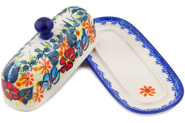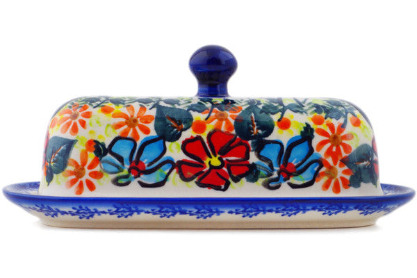 This Bold Poppies 7" Butter Dish was handmade and hand decorated in Boleslawiec, Poland by skilled artisans according to old traditional methods. This is a Polish pottery Signature Unikat, which means that it has been hand painted with both sponges and brushes and it is signed by the artist who painted it. Unikat pieces are the most intricate works of art. Larger Unikat items take hours of very careful work to finish. This Polish stoneware is microwave, dishwasher, freezer, and oven safe up to 480°F. It does not contain lead or cadmium. It is part of the Bold Poppies Collection.