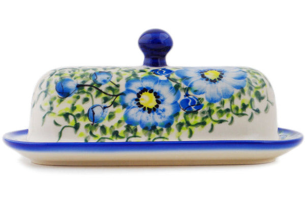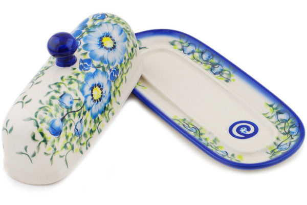 This Gorgeous Morning Glory 7" Butter Dish was handmade and hand decorated in Boleslawiec, Poland by skilled artisans according to old traditional methods. This is a Polish pottery Signature Unikat, which means that it has been hand painted with both sponges and brushes and it is signed by the artist who painted it. Unikat pieces are the most intricate works of art. Larger Unikat items take hours of very careful work to finish. This Polish stoneware is microwave, dishwasher, freezer, and oven safe up to 480°F. It does not contain lead or cadmium. It is part of the Gorgeous Morning Glory Collection.