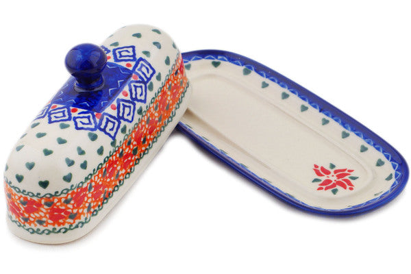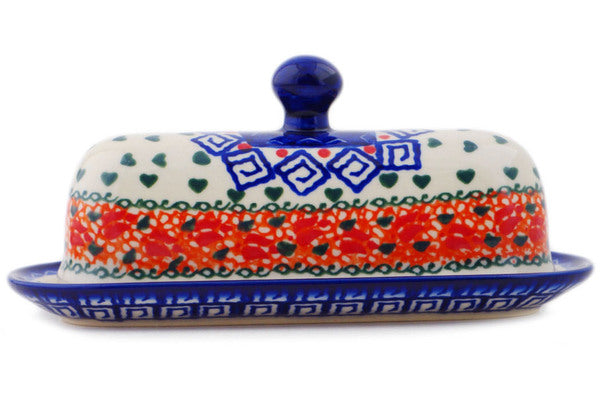 This Grecian Fire Tulips 7" Butter Dish was handmade and hand decorated in Boleslawiec, Poland by skilled artisans according to old traditional methods. This Polish stoneware is microwave, dishwasher, freezer, and oven safe up to 480°F. It does not contain lead or cadmium. It is part of the Grecian Fire Tulips Collection.