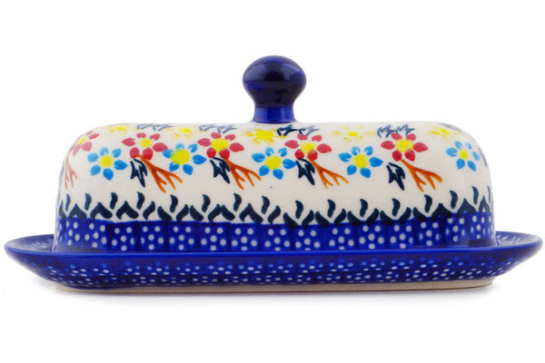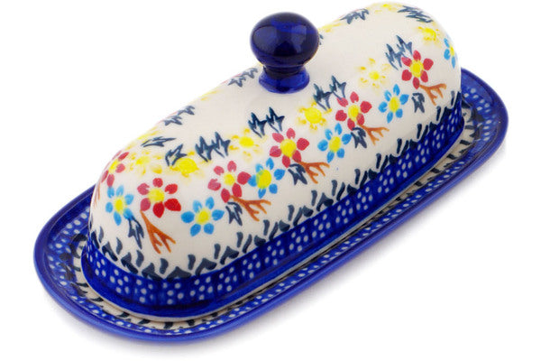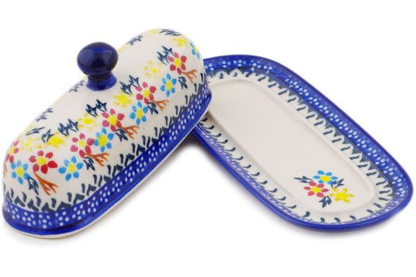 This Spring Flower Ring 7" Butter Dish was handmade and hand decorated in Boleslawiec, Poland by skilled artisans according to old traditional methods. This Polish stoneware is microwave, dishwasher, freezer, and oven safe up to 480°F. It does not contain lead or cadmium. It is part of the Spring Flower Ring Collection.