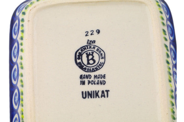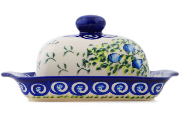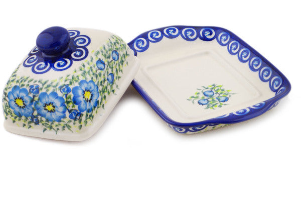 This Gorgeous Morning Glory 8" Butter Dish was handmade and hand decorated in Boleslawiec, Poland by skilled artisans according to old traditional methods. This is a Polish pottery Signature Unikat, which means that it has been hand painted with both sponges and brushes and it is signed by the artist who painted it. Unikat pieces are the most intricate works of art. Larger Unikat items take hours of very careful work to finish. This Polish stoneware is microwave, dishwasher, freezer, and oven safe up to 480°F. It does not contain lead or cadmium. It is part of the Gorgeous Morning Glory Collection.